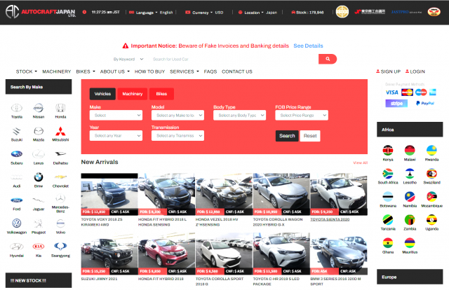 Autocraft Japan Ltd is one of the leading car exporters and auction agents of used and new vehicles in Japan. We provide all major Japanese cars and foreign vehicles including Japan used cars Toyota, Honda, Nissan, Mazda, Mitsubishi, Hino, Subaru, Suzuki, Isuzu, BMW, Mercedes-Benz, Volkswagen, Audi, Ford, Jaguar, Kia, Chevrolet, Volvo, Peugeot, Sangyong, Hyundai and many more. You should have a better idea of whether or not buying Japanese used cars/trucks for sale is right for you.