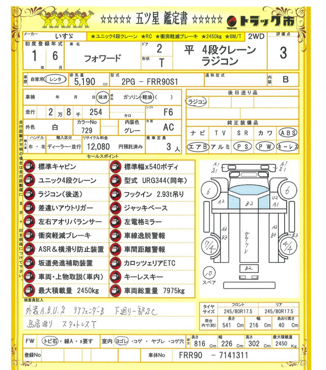 ★ユニック4段クレーン★RC★標準キャビン★標準幅×540ボディ★ラジコン(後送)★フックイン★2.93t吊★差違いアウトリガー★ジャッキベース★左右アオリバランサー★左電格ミラー★衝突軽減ブレーキ★★坂道発進補助装置★★車線逸脱警報装置★ASR&横滑り防止装置★ETC★キーレス★保証書・取説(車内)★