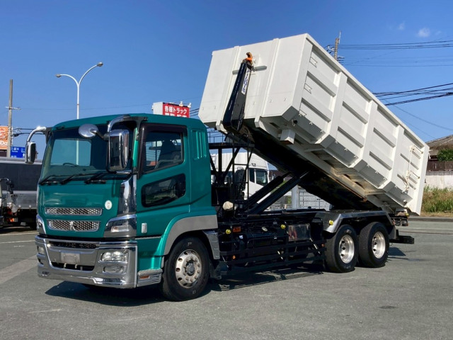 三菱ふそうスーパーグレート 10.1t脱着装置付コンテナ専用車 極東開発製 型式:JM10-53 ツインホイスト 380馬力 2デフ 可動式バンパー 電動コボレーン電源有 坂道発進補助装置 タコグラフ