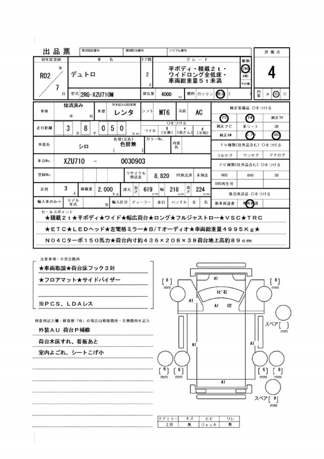 ★積載2t★平ボディ★ワイド★幅広荷台★ロング★フルジャストロー★VSC★TRC★ETC★LEDヘッド★左電格ミラー★B/Tオーディオ★車両総重量4995Kg★N04Cターボ150馬力★荷台内寸約436×208×38荷台地上高約89cm★車両取説★荷台床フック3対★フロアマット・サイドバイザー※PCS、LDAレス