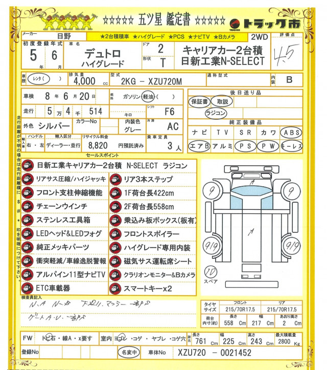 ★2台積載車★ハイグレード★専用内装★ラジコン★PCS★クラリオンモニター&Bカメラ★リアサス圧縮/ハイジャッキ★フロント支柱伸縮機能★チェーンウインチ★LEDヘッド&フォグ★フロントスポイラー★衝突被害軽減ブレーキ★車線逸脱警報装置★磁気サス運転席シート★純正メッキパーツ★アルパイン11型ナビTV★ETC★スマートキー★ステンレス工具箱★乗込み板ボックス(板有)★リア3本ステップ★