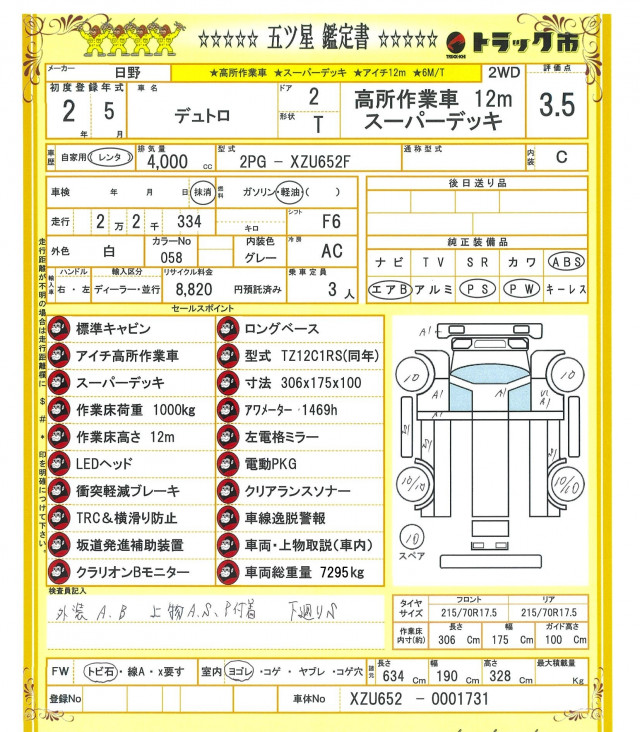 ★アイチ高所作業車★スーパーデッキ★標準キャビン★ロングベース★作業床荷重1000kg★作業床高さ12m★アワメーター1469h★LEDヘッド★左電格ミラー★電動PKG★クリアランスソナー★坂道補助装置★衝突被害軽減ブレーキ★TRC&横滑防止装置★車線逸脱警報装置★Bモニター★ETC★車両・上物取説★