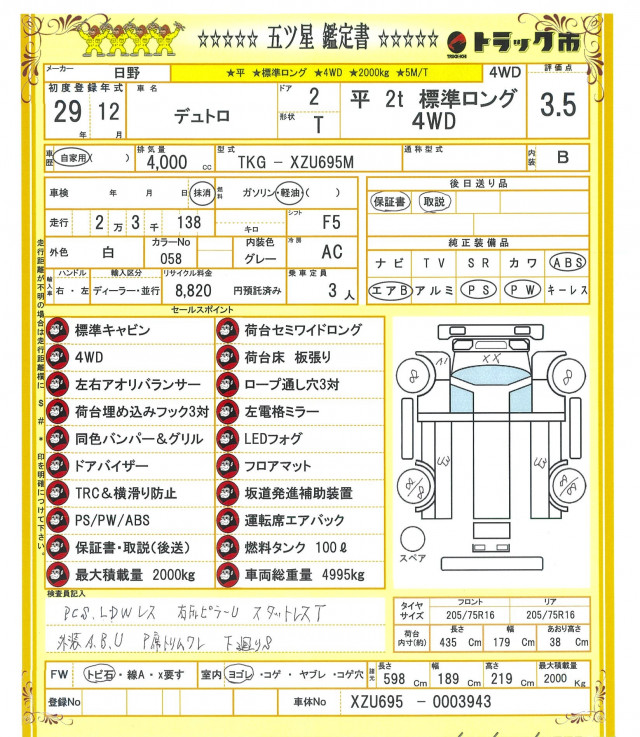 ★平ボディー★標準キャビン★荷台セミワイドロング★4WD★床板張り★左右アオリバランサー★ロープ通し穴3対★荷台埋め込みフック3対★左電格ミラー★LEDフォグ★TRC&横滑防止装置★坂道発進補助装置★保証書・取説(後送)★燃料タンク100L★