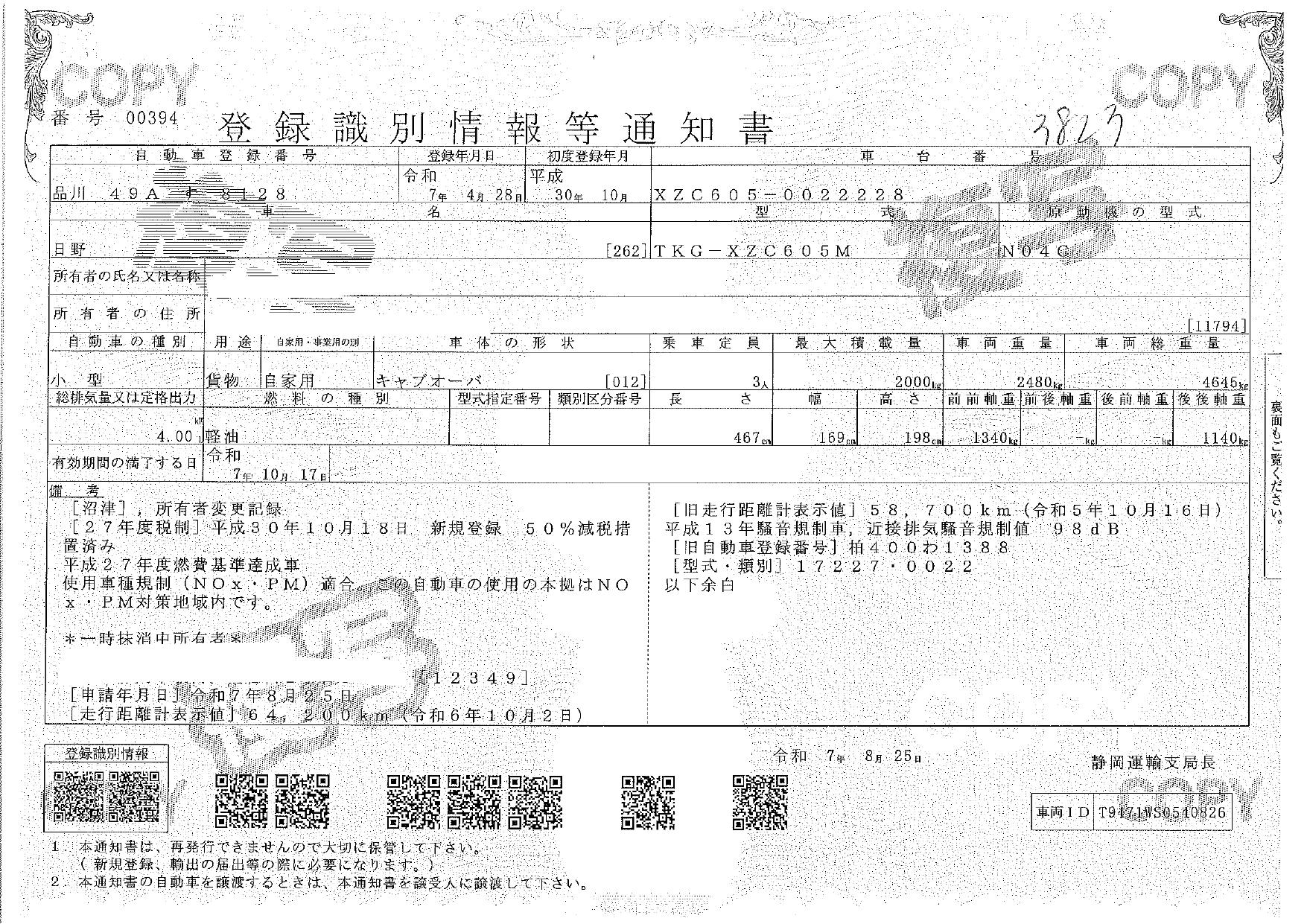 | 車検 | 抹消 |