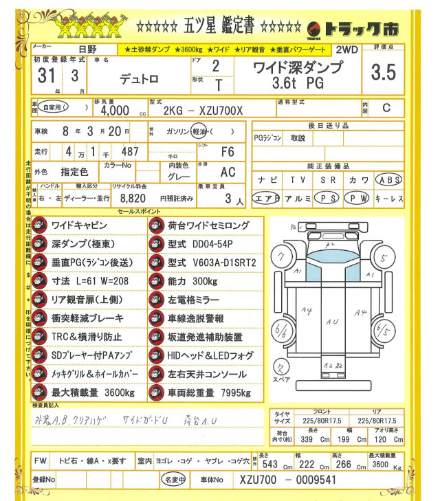 ☆深ダンプ(極東)☆DD04-54P☆土砂禁☆ワイドキャビン☆荷台ワイドセミロング☆垂直パワーゲート (ラジコン後送)☆PG寸法L61×W208cm☆能力300kg☆リア観音扉(上側)☆衝突軽減ブレーキ☆車線逸脱警報☆TRC&横滑防止装置☆坂道補助☆SDプレーヤー付PAアンプ☆メッキグリル&ホイールカバー☆HIDヘッド&LEDフォグ☆左右天井コンソール