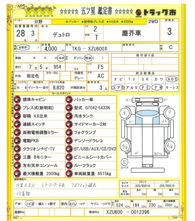 ☆標準キャビン☆パッカー車☆プレス式(新明和)☆GT042-5433N☆4.6立米☆汚水タンク☆連続スイッチ☆サイドマーカー2対☆両側電格調整ミラー☆フォグランプ☆電動PKB☆デンソードラレコ☆クラリオンナビTV☆Bluetooth/USB/AUX/CD/DVD☆三菱バックモニター☆ビニールシートカバー☆左右天井コンソール☆ルーフラック
