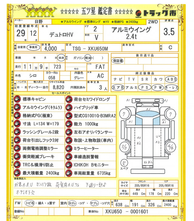外装ABU 看板跡 荷室内AUワレ 下廻り一部S オーディオ下穴 FW飛び石 室内汚れ・ヤブレ