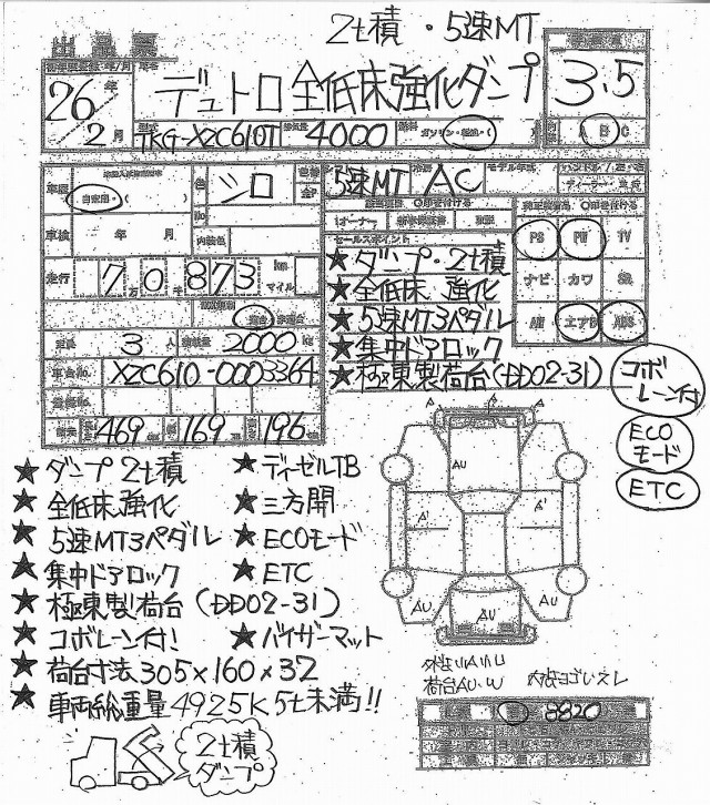 ★ダンプ ★2t積 ★全低床強化ダンプ三方開 ★5速MT3ペダル ★集中ドアロック ★コボレーン ★ECOモード ★ETC ★ディーゼルTB ★バイザーマット ★極東製荷台DD02-31 ★荷台寸法305-160-32★車両総重量4925K