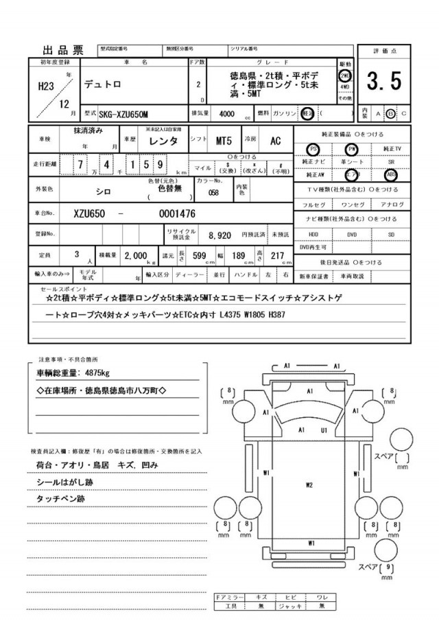☆2t積☆平ボディ☆標準ロング☆5t未満☆5MT☆エコモードスイッチ☆アシストゲート☆ロープ穴4対☆メッキパーツ☆ETC☆内寸 L4375 W1805 H387