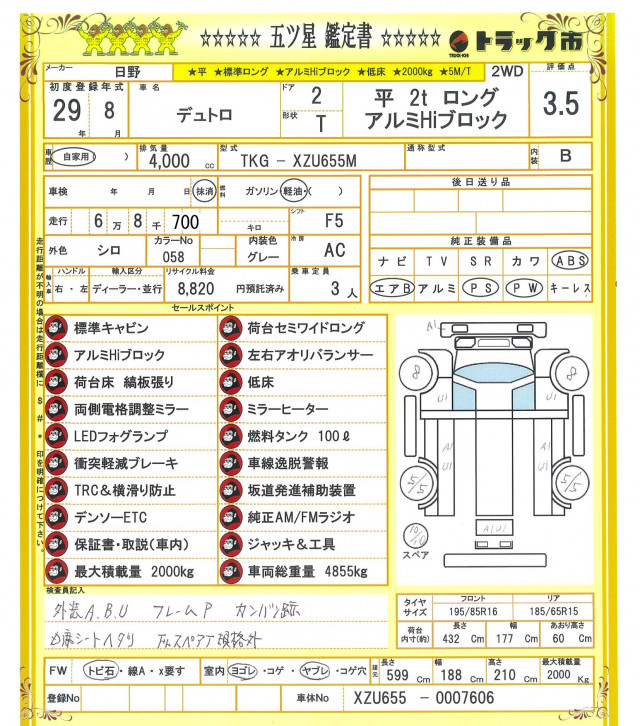 ☆平ボディー☆標準キャビン☆荷台セミワイドロング☆アルミHiブロック☆左右アオリバランサー☆荷台床縞板張り☆低床☆両側電格ミラー☆ミラーヒーター☆LEDフォグ☆衝突軽減ブレーキ☆坂道発進補助☆TRC&横滑防止☆車線逸脱警報☆ETC☆保証書☆