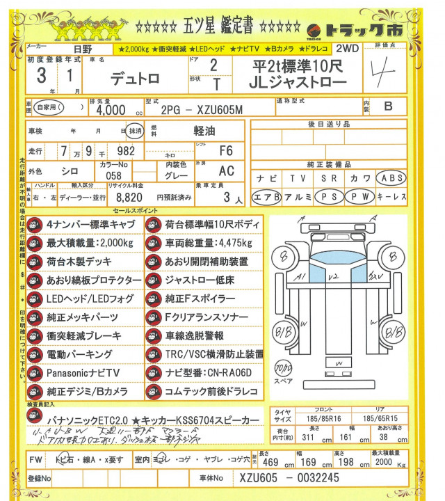 ☆標準10尺平ボディ☆ジャストロー低床☆荷台木製デッキ☆あおり開閉補助装置☆あおり縞板プロテクター☆純正フロントスポイラー☆純正メッキパーツ☆LEDヘッドライト/LEDフォグランプ☆Fクリアランスソナー☆車線逸脱警報☆衝突軽減ブレーキ☆TRC/VSC/横滑り防止装置☆ナビ・TV☆前後ドライブレコーダー☆純正デジタルミラー/バックカメラ☆ETC2.0☆2000kg