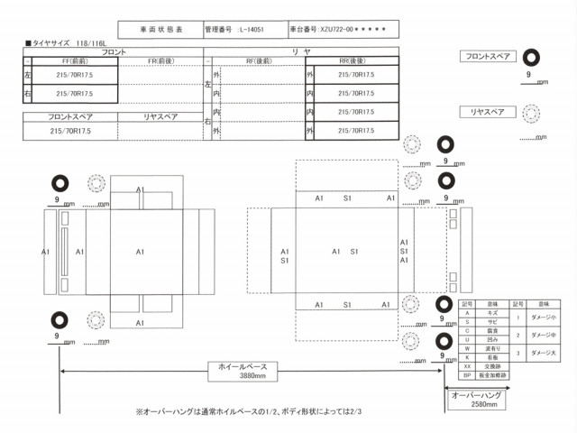 ▲車両外装:移動や屋外保管によるキズ・サビ小程度有り ▲キャビン:キズ微小・点サビ微小 ▲左右あおり:キズ小・サビ小・保管上のキズサビ程度あり ▲リヤあおり:接地によるキズ小・ローラーキズ・サビ小