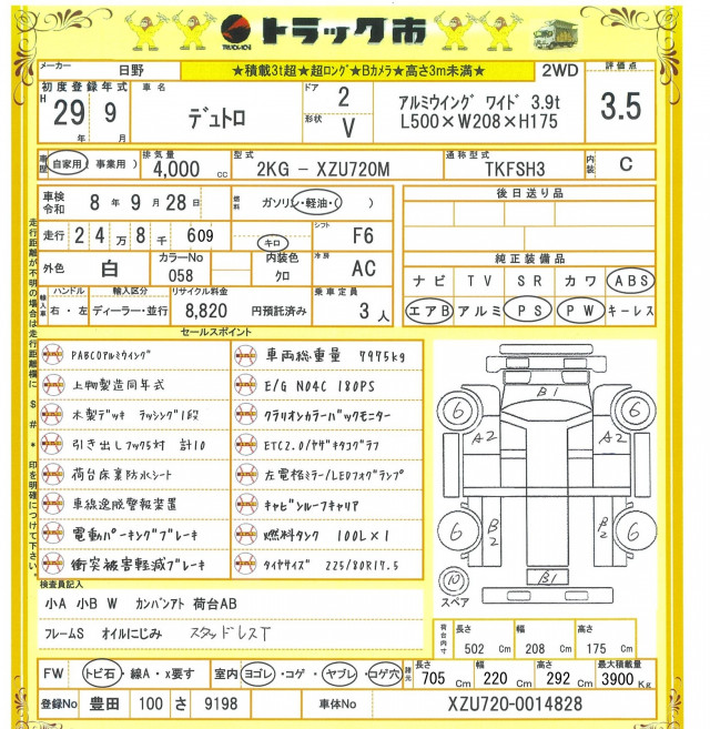 ☆アルミウイング☆ワイド超ロング☆木製デッキ☆ラッシングレール1段☆引き出しフック5対☆荷台床裏防水シート☆車線逸脱警報装置☆衝突軽減ブレーキ☆横滑り防止装置☆坂道発進補助装置☆電動パーキングブレーキ☆バックモニター☆ETC2.0☆タコグラフ☆ルーフキャリア☆LEDフォグランプ☆3900kg