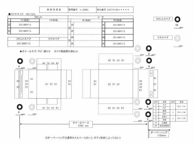 ▲フロントガラス:飛石キズ小 ▲フロントパネル:サビ小、凹み小 ▲ミラーカバー左右:一部色褪せ小、ステーサビ小 ▲キャビン外装:サビ小、えくぼ小、看板跡小 ▲助手席リクライニングレバー:カバー割れ ▲シガーライター:ストッパー不良(通電OK) ▲右テールレンズ:水滴小 ▲ボディ庫内等:サビ、凹凸小 ▲一部ホイールキズ曲り・一部タイヤ側面擦り※他、詳細はお問い合わせ下さい