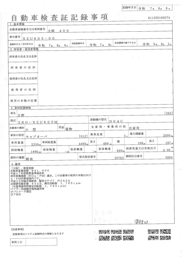 | 型式 | 2KG-XZU605M |