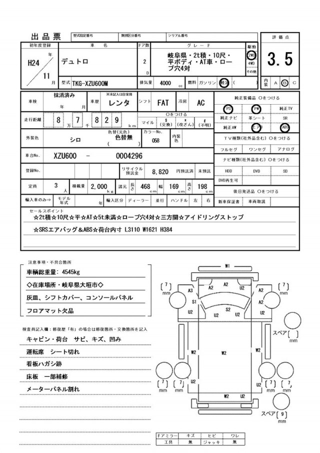 灰皿、シフトカバー、コンソールパネル、フロアマット欠品 キャビン・荷台 サビ、キズ、凹み・運転席 シート切れ・看板ハガシ跡・床板 一部補修・メーターパネル割れ