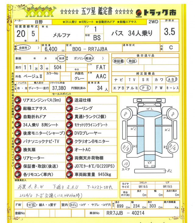 中型バス☆送迎仕様☆34人乗り☆8列シート☆自動折れドア☆総輪エアサス☆ニーリング☆貫通トランク×2☆モケットリクライニングシート☆後席モニター☆両側天井荷物棚☆リアヒーター☆換気扇☆ナビTV☆バックモニター☆DVDプレーヤー☆ETC☆AT