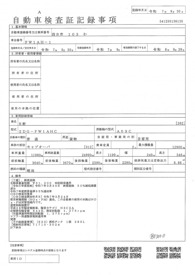 | 型式 | 2DG-FW1AHC |