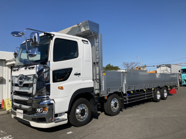 未使用・4軸低床・平ボディーが入荷いたしました。 ミッションはマニュアル7速でエンジンは380馬力、後輪エアサス仕様です。 荷台内寸はL=9.45m、W=2.35m、H=0.68m)で積載量は14,300㎏とれております。 ボディーは人気の高い山田車体製アルミブロックで蝶番はステンレスを使用しており、アルミホイール・キャブメッキ装着と見た目も良い一台です。是非この機会にお問い合わせください!