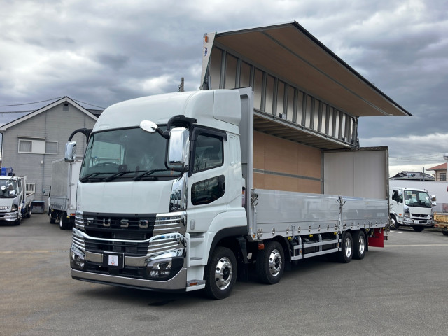 人気の日野!4軸低床のアルミウイングが新古車で入荷いたしました! 電磁リターダ付きでミッションはマニュアル7速、エンジンは380馬力の後輪エアサス仕様です。 荷台内寸はL=9.66m、W=2.40m、H=2.67mで積載量は13,900㎏とれております。 ハイルーフ・キャブメッキ付です。是非この機会にお問い合わせください!