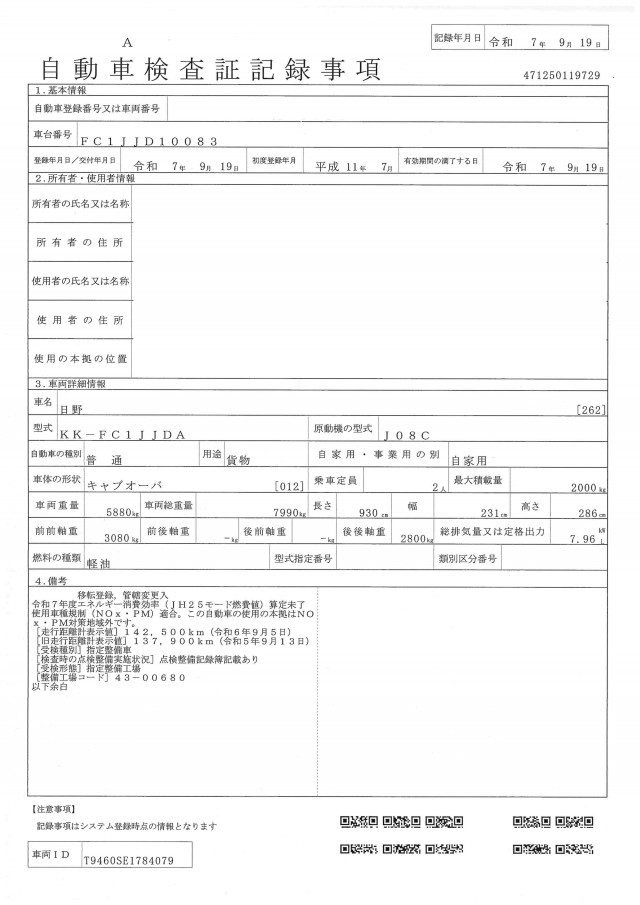 ★上物(クレーン側) 古河ユニック製 URA343K 3段クレーン フックイン 2.93t吊(1999年7月製:同年) ★上物(ローダー側) 古河ユニック製 UC-41CMKRR 車載専用車 スライドボディ 油圧ゲート ウインチ ラジコン付(1999年7月製:同年)