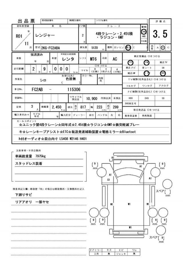 ☆ユニック製4段クレーン☆同年式☆2.45t積☆ラジコン☆6MT☆衝突軽減ブレーキ☆レーンキープアシスト☆ETC☆坂道発進補助装置☆電格ミラー☆Bluetooth付オーディオ☆荷台内寸 L5408 W2146 H401