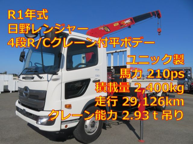 日野レンジャー 4段R/Cクレーン付平ボデー ユニック製 型式:URG344 フックイン付 クレーン能力2.93t吊り 差し違いアウトリガー 三方開 210馬力 ETC付 低走行車 坂道発進補助装置