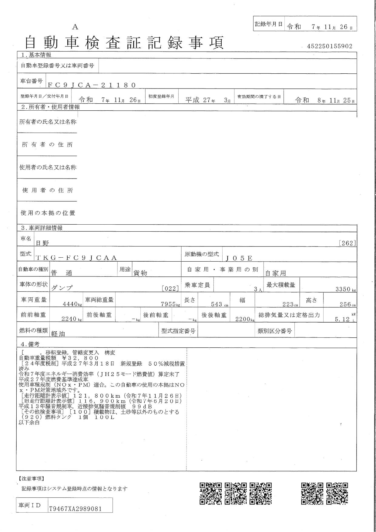 土砂禁ダンプ 極東 9.4立米 リヤー観音扉 ベッドレス
