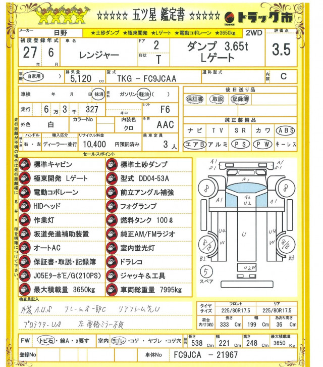 ☆土砂ダンプ☆Lゲート☆電動コボレーン☆前立アングル補強☆作業灯☆坂道発進補助装置☆フォグランプ☆HIDヘッドライト☆純正AM/FMラジオ☆ドライブレコーダー☆室内蛍光灯☆保証書・取説・記録簿