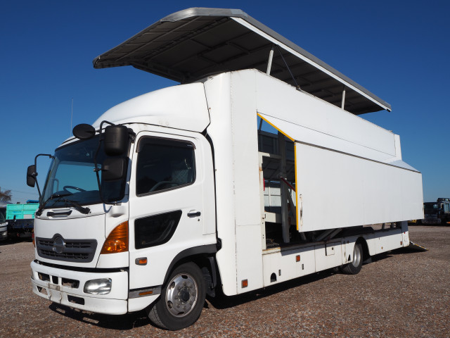 ★6400cc(ターボ) ★ミッション 6速マニュアル ★積載4300kg ★車両運搬車/車載車/キャリアカー ★浜名ワークス製 油圧リアゲート(低スロープ用道板付)/ウインチ/荷台ルーフ油圧昇降/サイドウイング/床面固縛ワイヤー/2CHラジコン(上物同年式) ★1階内寸(約)長さ753cm×幅247cm ★2階内寸(約)長さ456cm×幅224cm