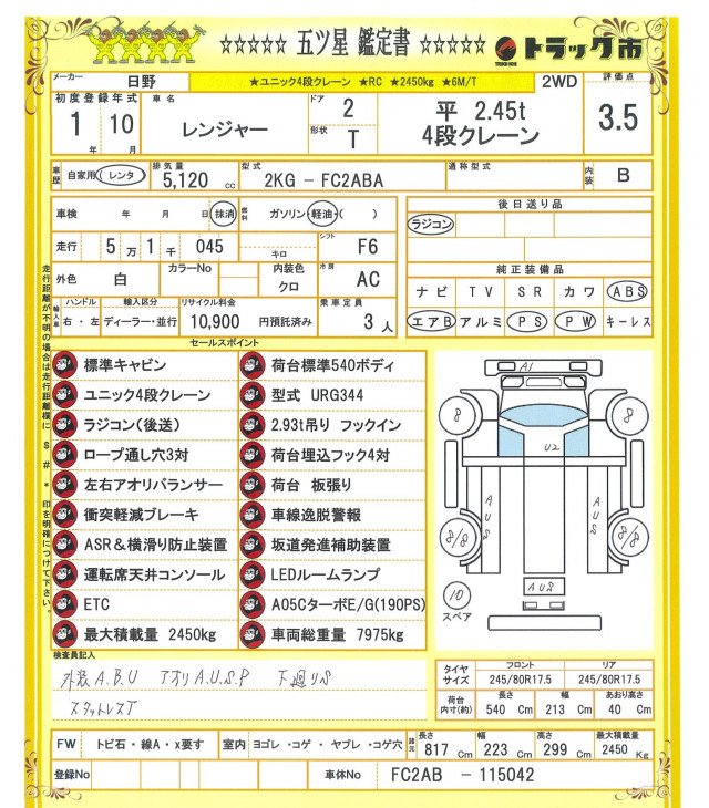 ☆ユニック4段クレーン☆標準キャビン☆荷台標準540ボディ☆ラジコン(後送)☆2.93t吊☆フックイン☆ロープ通し穴3対☆埋込フック4対☆左右アオリバランサー☆床板☆衝突軽減ブレーキ☆坂道発進補助☆運転席天井コンソール☆LEDルームランプ☆