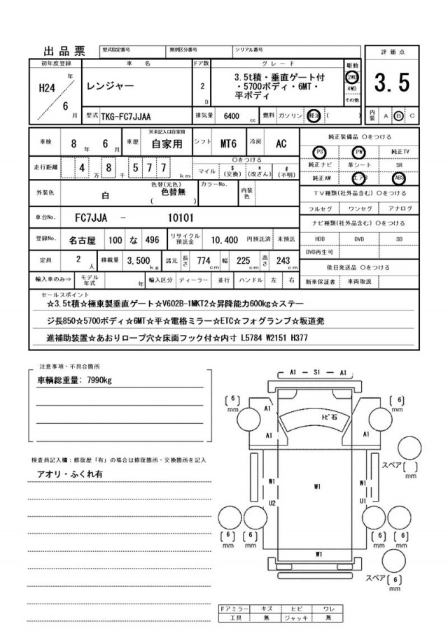☆3.5t積☆極東製垂直ゲート☆V602B-1MKT2☆昇降能力600㎏☆ステージ長850☆5700ボディ☆6MT☆平☆電格ミラー☆ETC☆フォグランプ☆坂道発進補助装置☆あおりロープ穴☆床面フック付☆内寸 L5784 W2151 H377