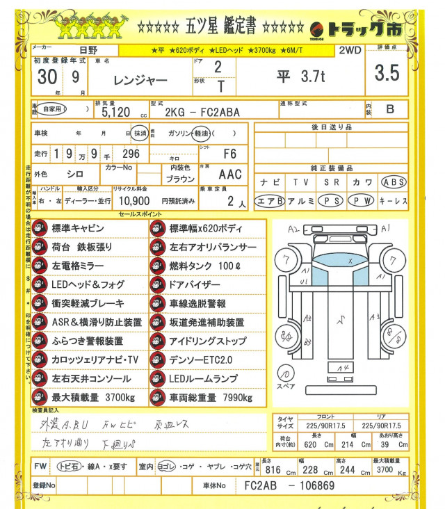 平ボディ☆標準幅×620ボディ☆荷台鉄板張り☆左右アオリバランサー☆車線逸脱警報☆衝突軽減ブレーキ☆坂道発進補助装置☆横滑り防止装置☆ふらつき警報☆LEDヘッドライト&LEDフォグランプ☆左電格ミラー☆ETC2.0☆ナビ・TV☆6MT