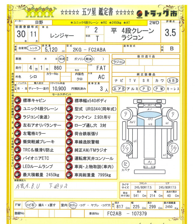 ☆2.45トン☆4段クレーン☆平ボディー☆ラジコン☆標準キャビン☆標準幅×540ボディ☆ユニック☆フックイン☆2.93t吊☆左右アオリバランサー☆ロープ通し穴3対☆荷台鉄板張り☆衝突軽減ブレーキ☆車線逸脱警報☆TRC&横滑防止装置☆左電格ミラー☆ETC☆純正AM/FMラジオ☆運転席天井コンソール☆LEDルームランプ☆車両取説/上物取説☆2450kg