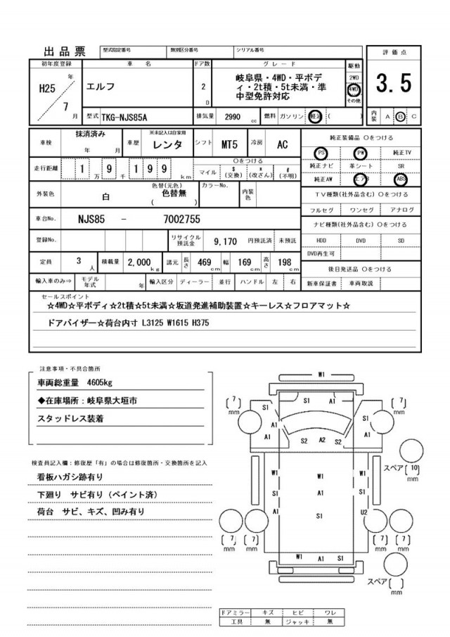 スタッドレス装着・看板ハガシ跡有り・下廻り サビ有り(ペイント済)・荷台 サビ、キズ、凹み有り