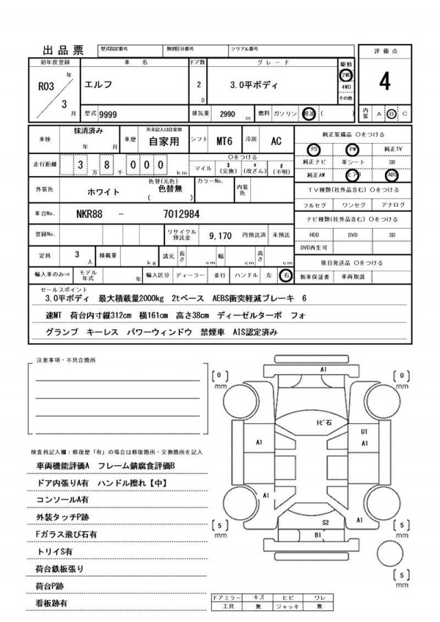 最大積載量2000kg 業販可 2tベース AEBS衝突軽減ブレーキ 6速MT 荷台内寸 縦312cm 横161cm 高さ38cm ディーゼルターボ フォグランプ キーレス パワーウィンドウ 禁煙車 リヤWタイヤ AIS査定済み