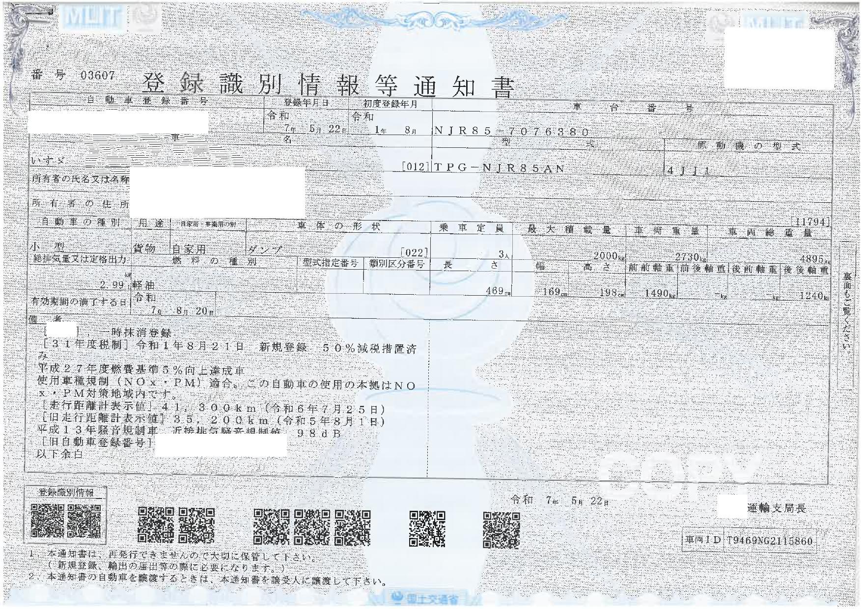 ※抹消車両は、登録時最大積載量が減トンされる可能性が御座います。