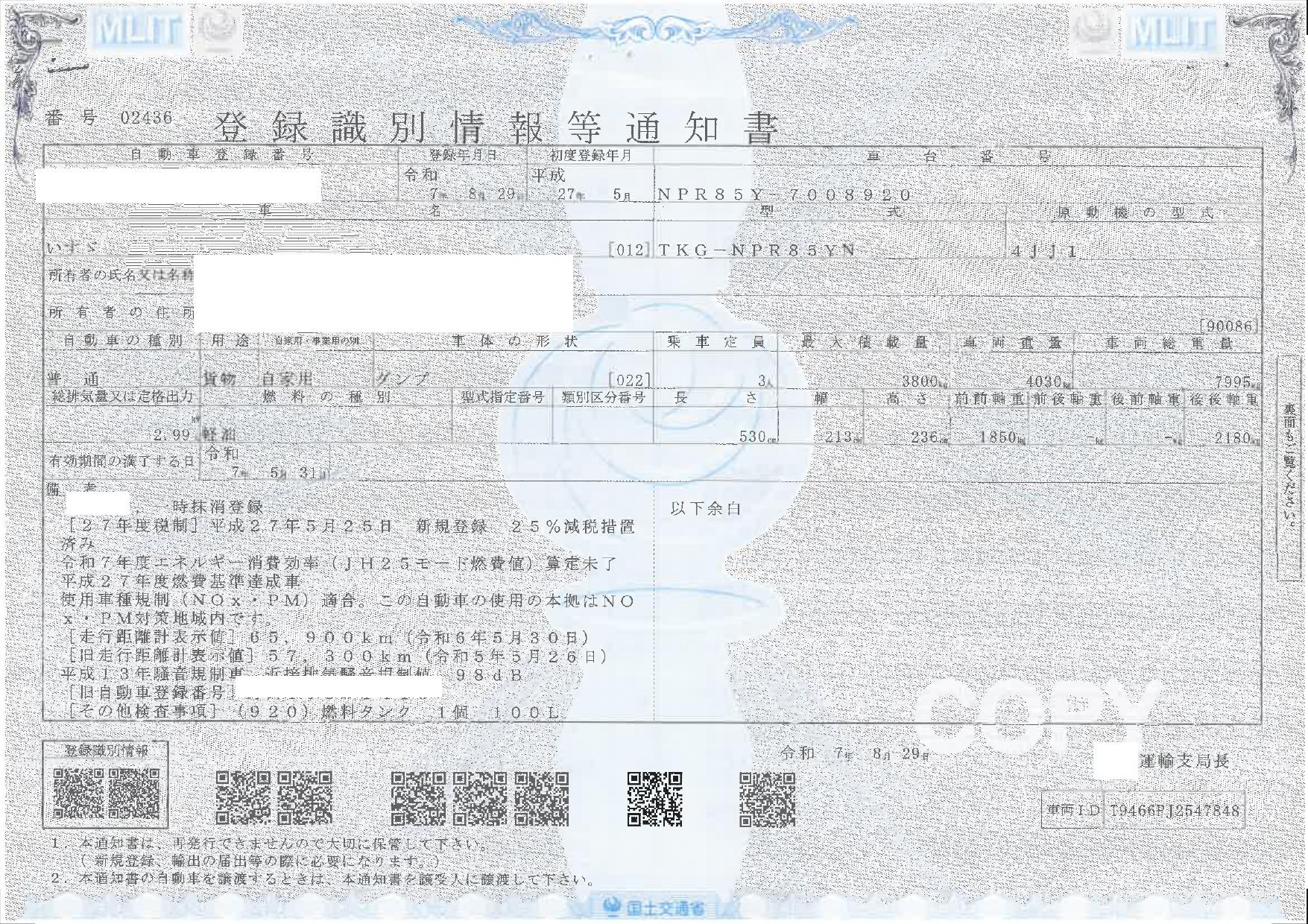 ※抹消車両は、登録時最大積載量が減トンされる可能性が御座います。