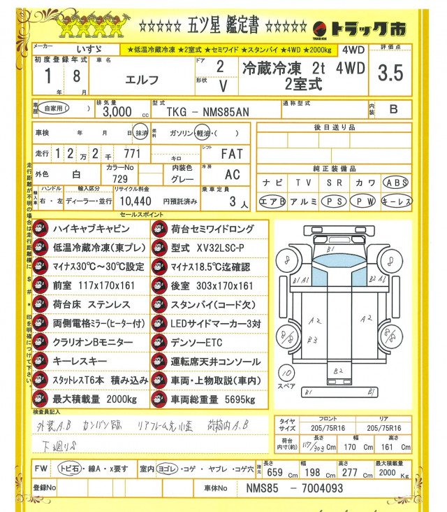 ★低温冷蔵冷凍車(東プレ)★2室式★セミワイド★スタンバイ(コード欠)★4WD★ハイキャブキャビン★荷台セミワイドロング★-30℃~30℃設定★-18.5℃迄確認★床ステン★LEDサイドマーカー3対★両側電格ミラー(ヒーター付)★デンソーETC★クラリオンBモニター★キーレス★運転席天井コンソール★車両・上物取説(車内)★スタットレスタイヤ6本積込み★ 外装A.B カンバンアト リアフレーム先小歪 荷箱内A.B 下廻りS
