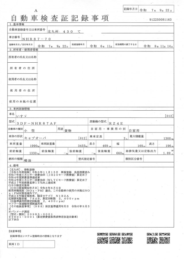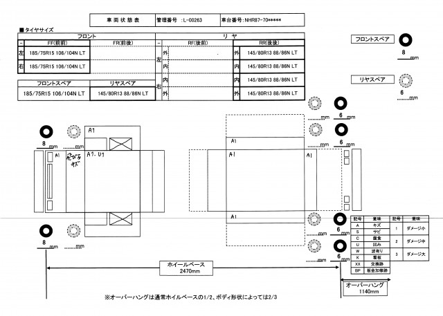 ▲フロントガラス:飛び石キズ小 ▲キャビン内装:スリキズ小、シール破れ小 ▲キャビンルーフ:凹み小、タッチペン跡 ▲シャーシ・下回り・マフラー:サビ小 ▲扉下部:凹み小 ▲外部電源取入口・各種電装品・庫内換気扇・シンク:作動未確認 ◎付属の移動販売車ボディは、現状は積載物扱いの為、4ナンバー・平ボディでの登録。販売車等の特種用途自動車(8ナンバー)へ構造変更する場合は減トンの可能性がございます。