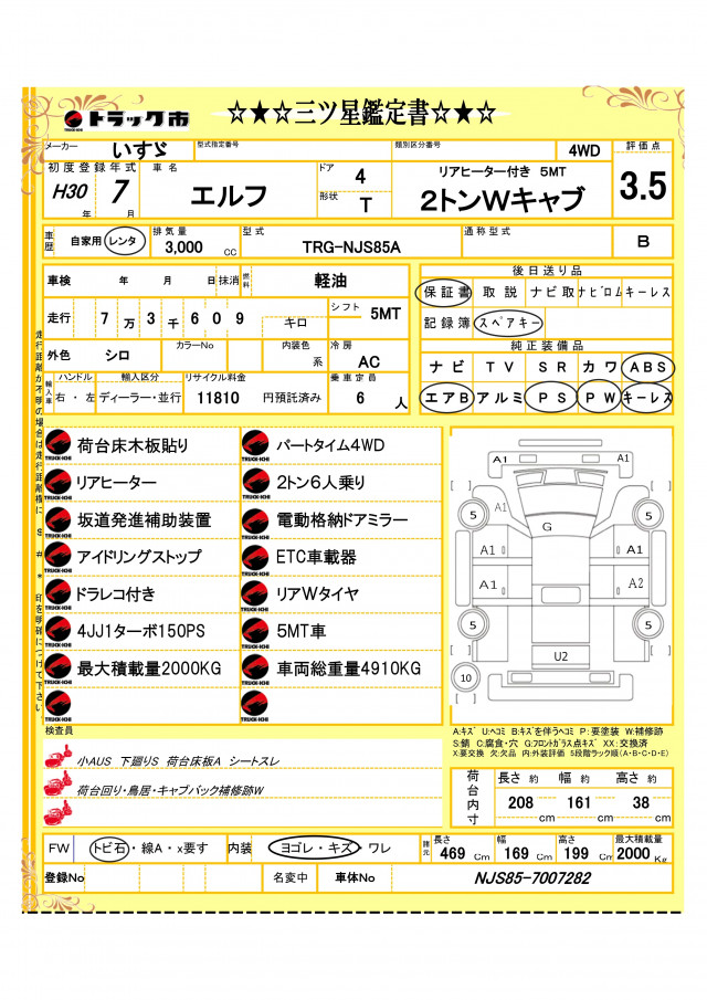 2トンWキャブ 4WD 荷台床木板貼り リアヒーター付き アイドリングストップ 電動格納ミラー 坂道発進補助 ETC ドラレコ 5MT