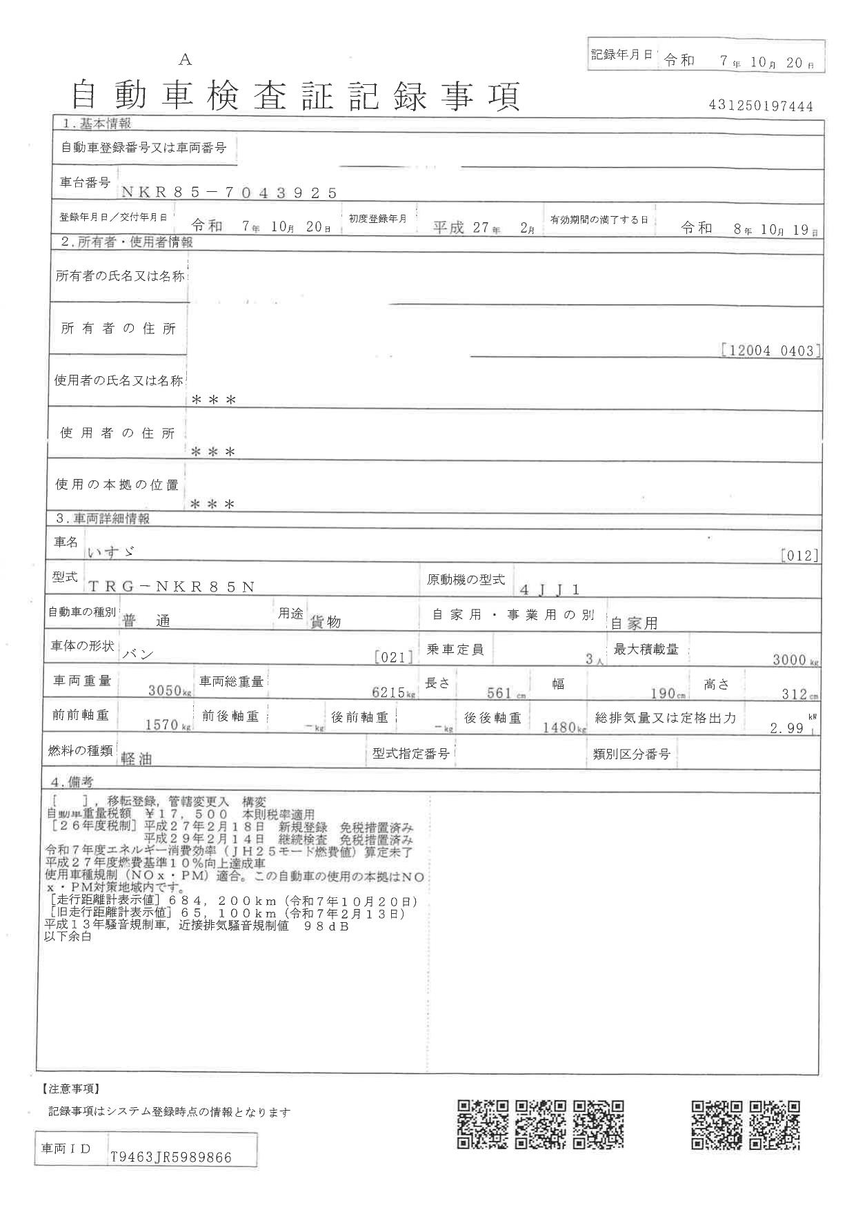 | 走行距離 | 69,000(km) |