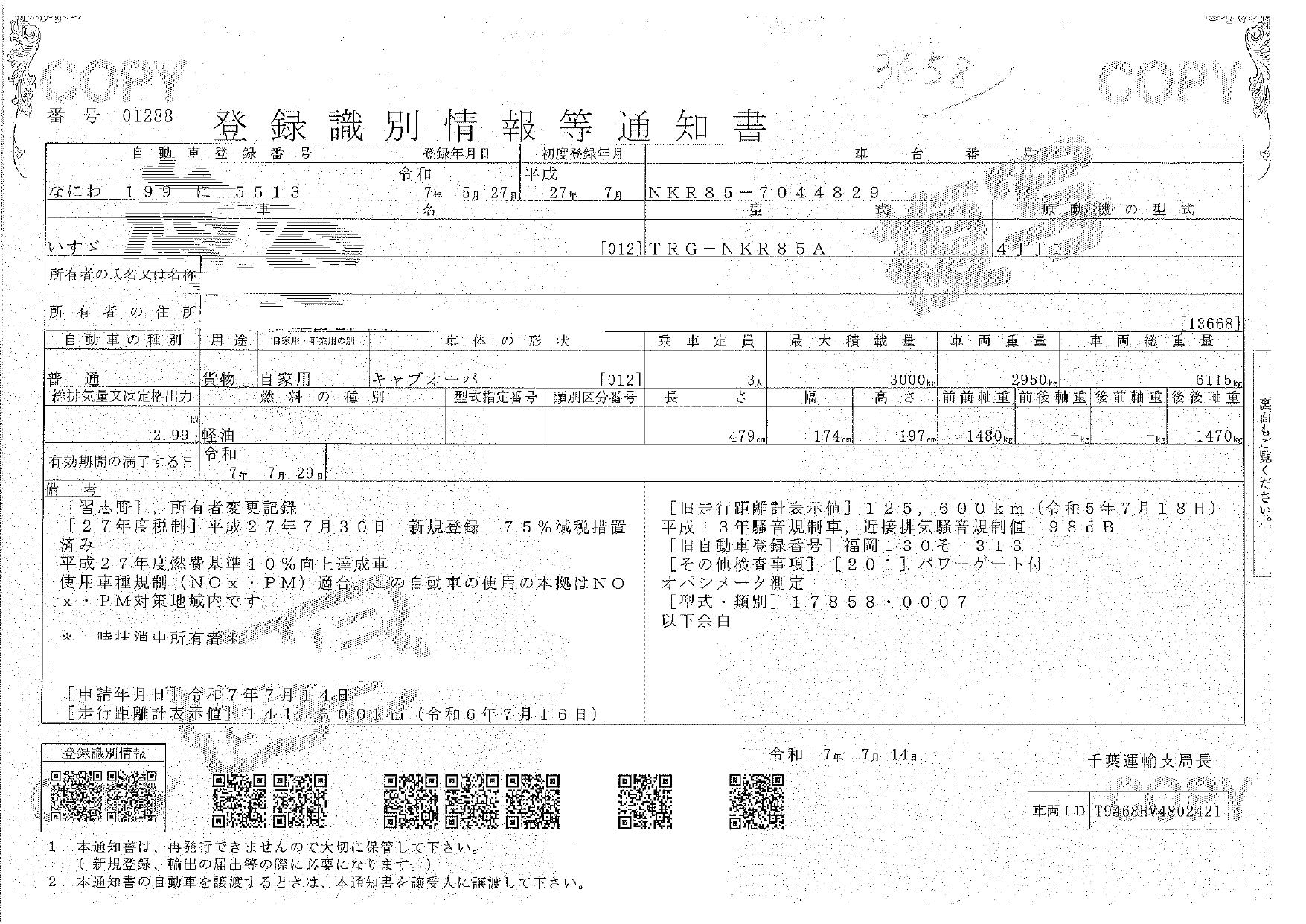 | 車検 | 抹消 |