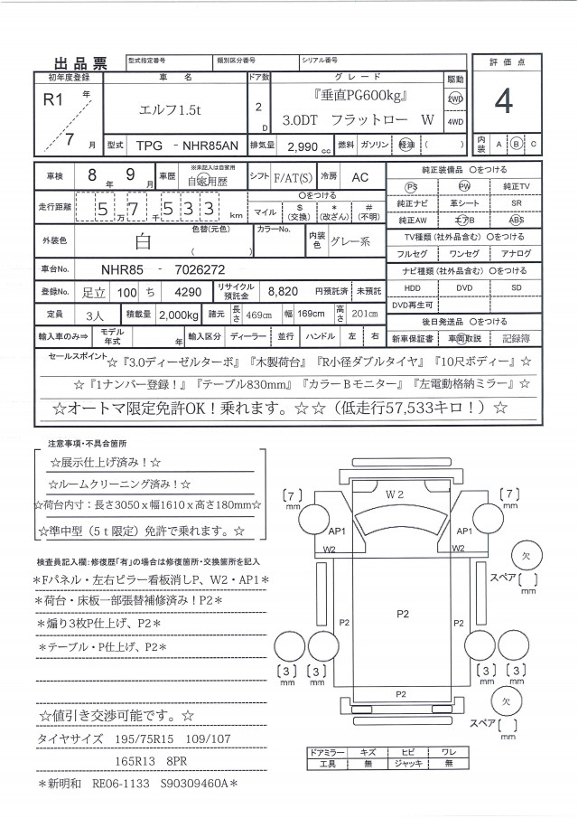 ☆R1年エルフ1.5tフラットロー(ダブル)『垂直PG600kg/テーブル830mm』木製荷台・10尺ボディー☆(低走行57,533キロ!)(1ナンバー登録!)(車検長いR8年9月23日迄。)『カラーBモニター』『左電動格納ミラー』☆準中型(5t限定)免許で乗れます。☆オートマ限定免許OK!乗れます。☆遠方の方でも安心!ルームクリーニング済み!☆展示仕上げ済み!☆