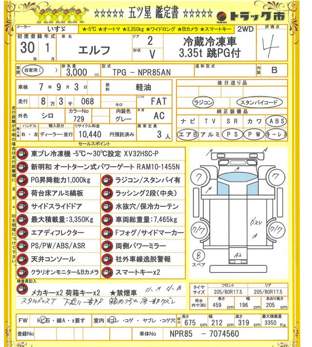 冷蔵冷凍車☆オートターン式パワーゲート☆ワイドロング☆積載3350kg☆ラジコン☆スタンバイ有り☆サイドスライドドア☆荷台床アルミ縞板☆ラッシングレール2段☆水抜き穴☆保冷カーテン☆車線逸脱警報☆サイドマーカー☆バックカメラ☆スマートキー