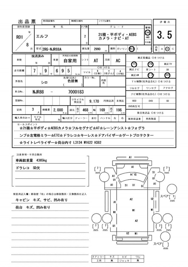 ドラレコ SD欠・キャビン キズ、サビ、凹み有り・荷台 キズ、凹み有り
