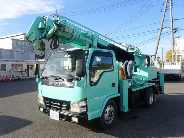 ★平成17年式/いすゞ/エルフ/穴掘建柱車/D50A ★アイチコーポレーション/オーガスクリュー・ヘッド付 ★100L水タンク・散水ポンプ・散水リール付 ★標準/10尺/積載無し/8ナンバー(2年車検) ★Nox・PM適合/関東登録、乗入れOK!(アドブルー不要) ★準中型免許(車両総重量7.5t未満)で運転できます