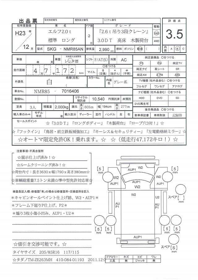☆H23年エルフ2.0t『ロング』高床『2.6t吊り3段クレーン・フックイン』木製荷台(低走行47,172キロ!)☆『鳥居・前立鉄板補強』『ロープ穴3対!』『キャビンオールペイント仕上げ跡』『キーレス&セキュリティー』『左電動格納ミラー』☆車輌総重量7.5トン未満☆準中型免許対応車☆オートマ限定免許OK!乗れます。☆遠方の方でも安心!ルームクリーニング済み!☆展示仕上げ済み!☆