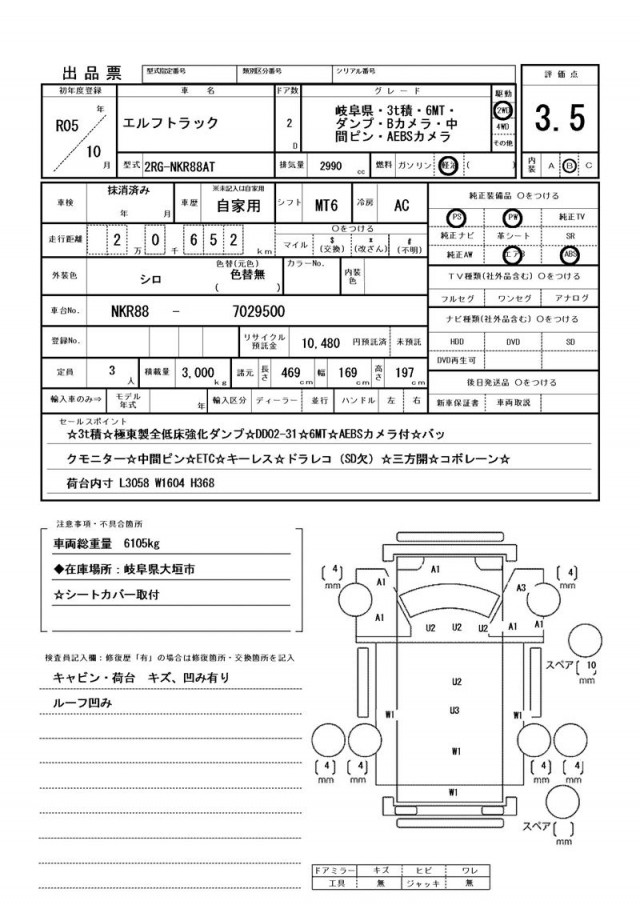 キャビン・荷台 キズ、凹み有り・ルーフ凹み
