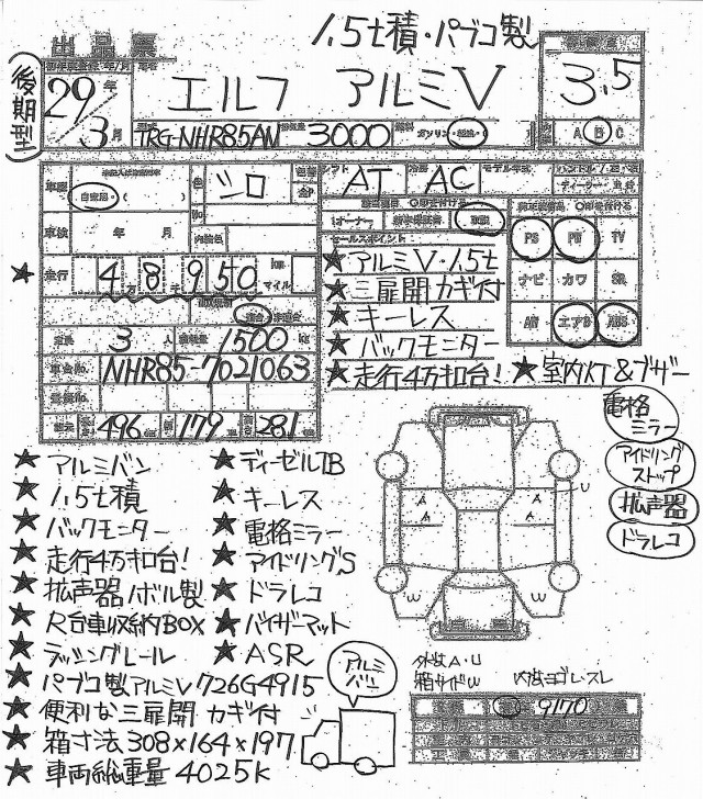 ★アルミV ★1.5トン積 ★三扉開カギ付 ★キーレス ★バックカメラ ★走行4万キロ台! ★室内灯ブザー付 ★アイドリングS ★電格ミラー ★拡声器ノボル製 ★ラッシングレール ★パブコ製726G4915 ★箱寸法308-164-197